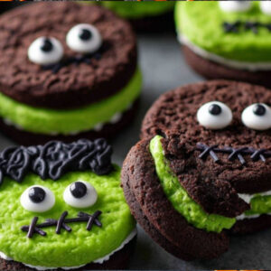 Chocolate sandwich cookies with bright green buttercream filling that look like Frankenstein’s face—complete with candy eyes, messy black frosted hair, and that classic stitched scar. The cookies are soft and chocolatey, the green buttercream is sweet and creamy, and they require a little decorating time but nothing too complicated. Even if your piping skills are shaky, they’ll still come out looking cute and spooky.