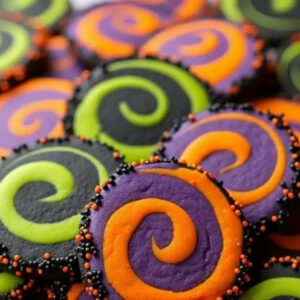 Basic sugar cookie dough divided in half, colored (orange and black is classic), stacked, rolled up, and sliced to create a cool spiral pattern. They look way more complicated than they actually are, and the swirl makes them look like you really know what you’re doing. Use gel food coloring for vibrant colors, and don’t skip the chilling time or your spirals will turn into blobs.