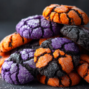 Chocolate cookies rolled in powdered sugar that crack and “crinkle” when they bake—for Halloween, make them extra dark with black cocoa powder or roll them in colored sugar (orange, purple). They’re fudgy in the middle, slightly crisp on the outside, and the crackly sugar coating makes them look really cool. Don’t skip chilling the dough because it needs to be cold for that signature crackle pattern.